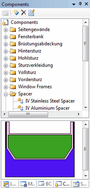 The Components flyout allows the management of components. Components are construction elements such as window frames or wall constructions that are regularly used in the various documents.