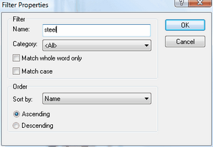 Under Name you can enter the name or part of the material name that you are searching for. Additionally, you can define the Category for which you would like to limit your search to. After you have defined the filter criteria, click on OK, and the filter results will be displayed in the materials database window of the flyout.