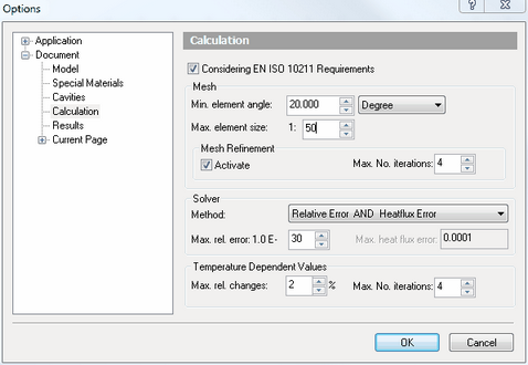 Determines the maximum heat flow error according to standard EN ISO 10077-2 (see above). If this method is selected, the resulting system equation will be solved iteratively until the relative heat flow error is less than this value, or until the maximum number of iterations has been reached. |