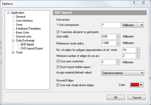 These setting are used for importing CAD files with DXF files. The importing of DXF files is described in detail in tutorial 3.