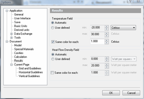 In the results dialog window, the coloring of the temperature and heat flux fields can be determined.