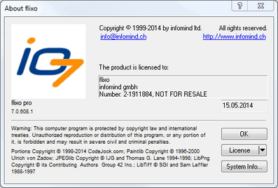 In this dialog window, you can find copyright information and details about your license. The dialog window can be activated with menu command Help.