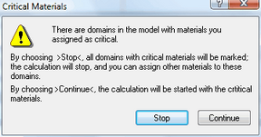 The calculation is stopped and all domains with critical materials are highlighted. By repeatedly clicking on the "Zoom In" button in the message line, all critical material domains will be highlighted in order to assign other materials to these domains. These highlights will disappear in the next calculation. |