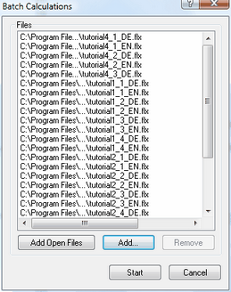You have the option to calculate many files at once, e.g. over night. The files can be defined in a special dialog window.