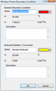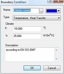 Type of boundary condition. The following types of boundary conditions are supported: - Temperature, h-value: For boundaries, where the air temperature and the heat transfer coefficient are present. This type of boundary condition is used for normal boundary conditions. - Temperature (Dirichlet): For boundaries, where the surface temperature is given (e.g. the entering temperature for a floor heating system). - Heat Flux (Neumann): For boundaries, where the heat flux for a surface is given. - Heat Flux, Temperature (Cauchy): For boundaries, where the heat flux and the surface temperature are given. - Source/Sink: For the performance of linear sources and sinks (see Heat Source Tool). - Radiation: For the definition of surface radiation properties (emissivities) of air cavities, if the surface properties are calculated by flixo (cf. Option dialog window cavities). - Window Frame: For interior boundaries when calculating the frame U-value according to EN ISO 10077-2 (cf. tutorial 4). The line properties, the name of the 2 dependent boundary conditions for normal domains, and the domains with reduced h-values can be adjusted by clicking on the Boundaries button and entering the values in the dialog window (see Figure 4) that appears. |