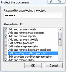 Protects the document selectively against changes of certain properties. Actions which are selected in the list may be adapted by users: - Add an remove models: Add new model pages and delete existing ones. - Add an remove master reports: Add new templates and delete existing ones. - Add an remove reports: Add new reports and delete existing ones. - Add an remove materials: Add new materials and delete existing ones. - Edit material properties: Change material properties. - Edit material representation: Change appearance-related properties (e.g. color) of materials. - Add and remove boundary conditions: Add new boundary conditions and delete existing ones. - Edit boundary condition properties: Change boundary condition properties. - Edit boundary condition representation: Change appearance-related properties (e.g. color) of boundary conditions. - Add and remove styles: Add new styles (appearance-related properties of result objects such as the number of decimal places) and delete existing ones. - Edit styles: Change style properties. - Edit calculation options: Change Calculation options. - Edit model options: Change Model options. - Edit cavity options: Change Cavity options. - Edit special material options: Change Special material options. - Edit result options: Change Result options. |
