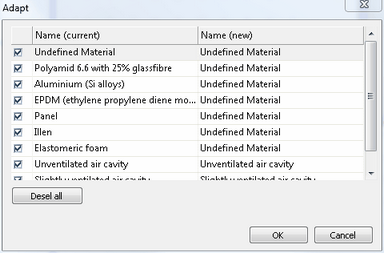 If you choose this option, all materials selected in a dialog window of the document are replaced by those of the template. Click on the ... button to open the dialog window (see Figure 2). In the dialog you can select the materials which will be replaced by the existing materials from the template. The new material from the template can be selected from a list by clicking into the last column. |