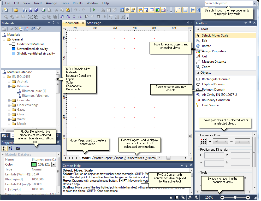 Here is a basic screen shot of flixo with the most important components. You can click on the individual symbols of the figure to jump to the corresponding documentation.