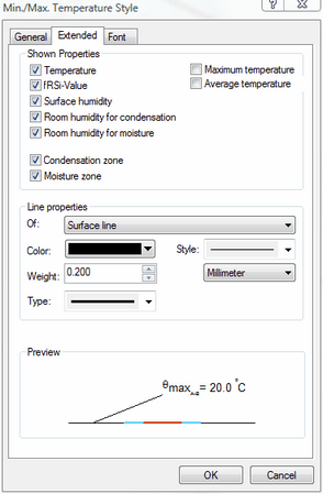 If this option is activated, zones where the surface humidity exceed the critical humidity will be displayed with a unique line style - only if this zone is present. The properties of the polyline you can adapt in the setting group line properties (Of: Moisture zone). The critical surface humidity you can define in the Properties flyout of the min./max. temperaturobject. |