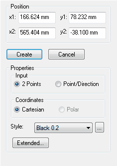 Enter the x- and y-coordinates of the start point into the appropriate fields, and then enter the coordinates of the endpoint (or the direction and length of the line). The coordinates can either be defined as cartesian or polar coordinates. To end the entry click on the Create button.