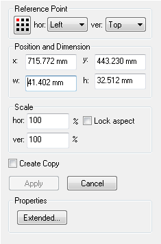 indicates, which point on the object (corner, midpoint, or object center) is to take the coordinates. You can change the reference point (after activating it with Tab) with the arrow keys or with the mouse. You can finish the input by either clicking on the Apply button or by activating it with the Tab key and then hitting Return.