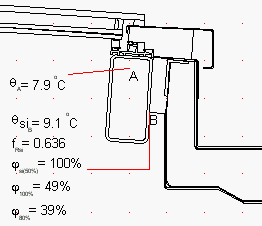 Room humidity φ80%, is shown at the surface temperature spot where the surface humidity is 80%. In the example above with a 39% room humidity there would be an 80% humidity at that minimum surface temperature spot. This value depends on the selected interior temperature and therefore the room humidity must be respectively calculated for different interior temperatures.